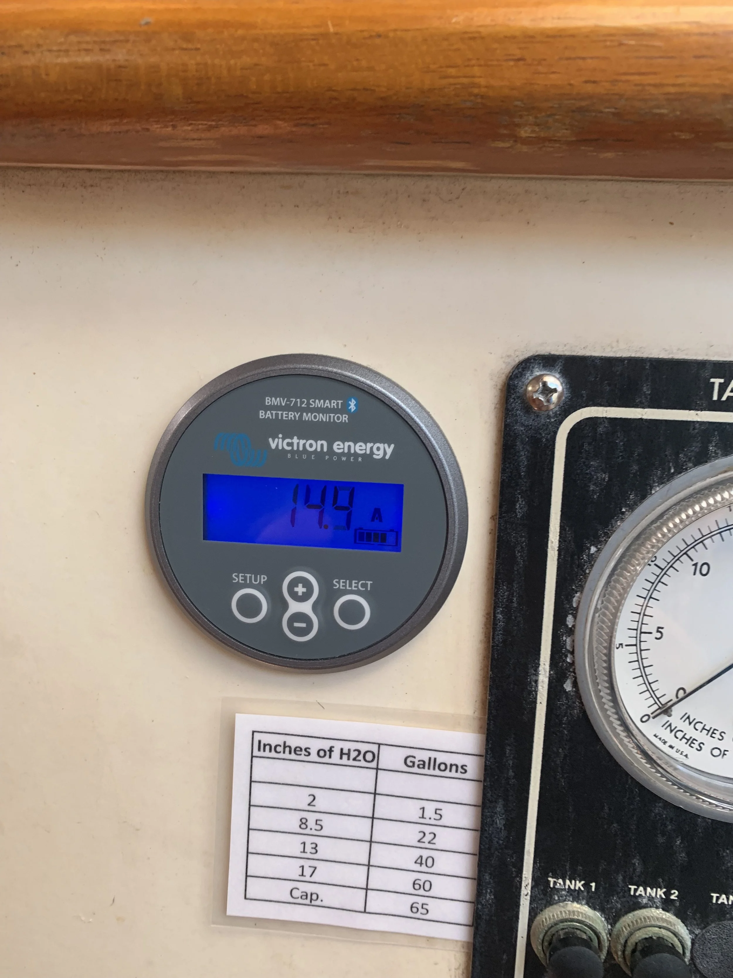 The monitor is showing 14.4 amps of current flowing in to charge the house batteries. This monitor has alarms for high and low voltage and for high temperature (good for lithium ion batteries with sensors fitted). It also can connect to your cell phone via app. Photo by: Chris Snow