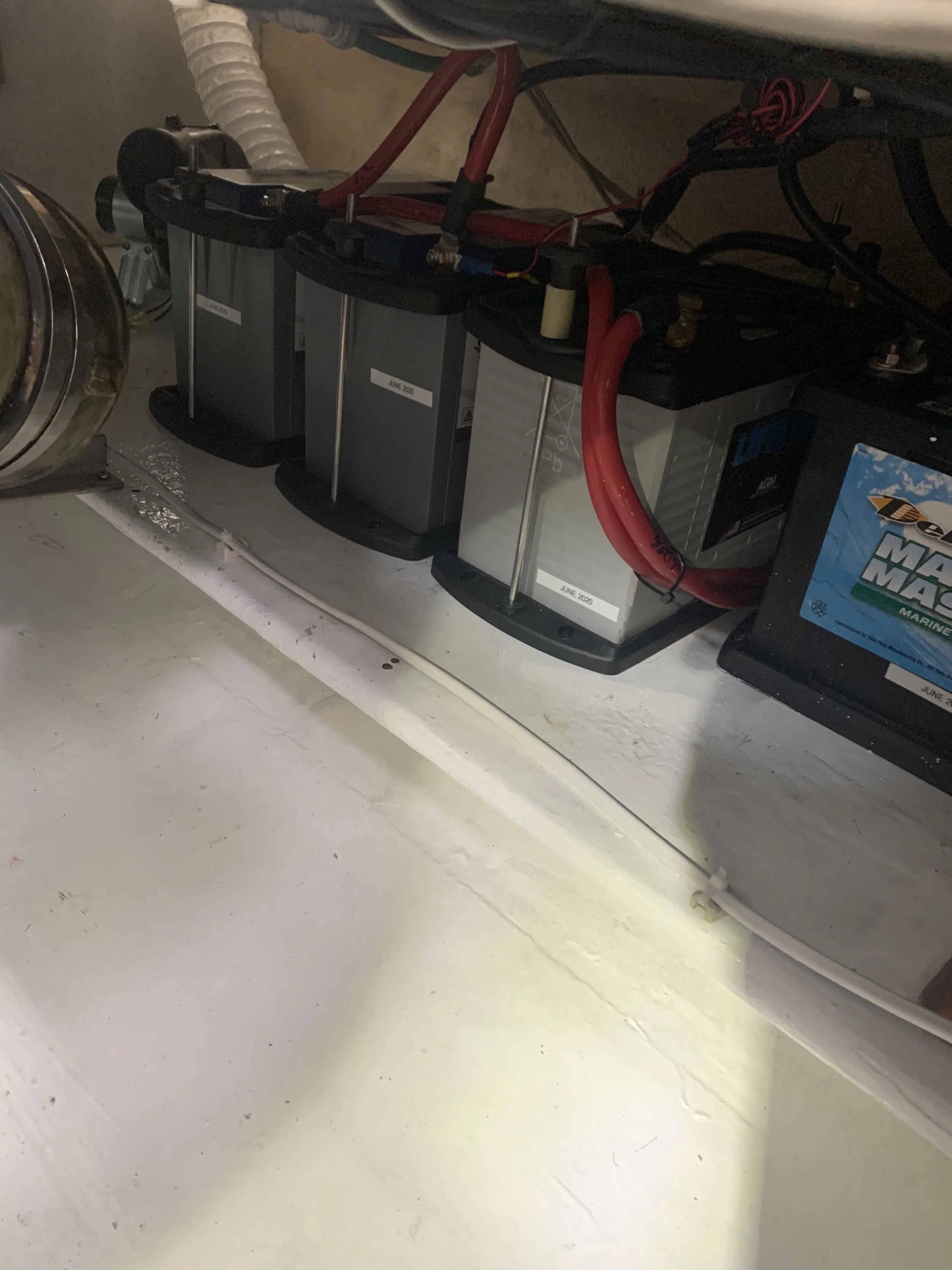 Pay close attention to your boat’s battery system. Without a strong battery system, your boat is literally dead in the water. The basic idea is that the starting batteries for the engine and generator need to be isolated from other potential uses. This ensures that their full power is always available to start the engine and generator (if you have one). Once the engine is started, you can use the engine alternator to charge the rest of the batteries on the boat if needed. These are typically the house batteries (used to run lights, refrigerators, toilets, etc.) and the auxiliary battery for the bow thruster and windlass. Note also that you can use the generator to charge batteries by running it and your 120V powered battery charger.